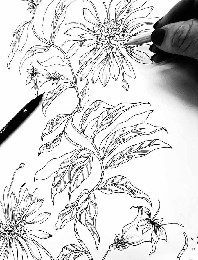 Graduate collection of wallpaper and home furnishing prints for high-end interiors. Prints depict otherworldly, fictional narratives that encourage playful imaginations and evoke a feeling of escapism. Morphed canopy creatures are entwined amongst fantastical alien flora and fauna. Hand-rendered illustrations depict imagined utopian habitats, merging the line between observational and imagined drawing.