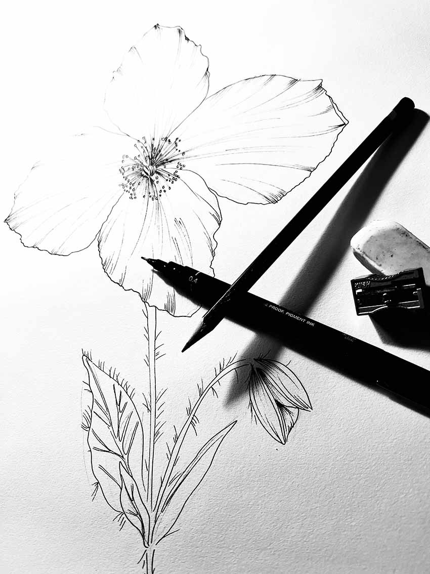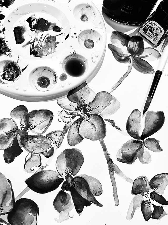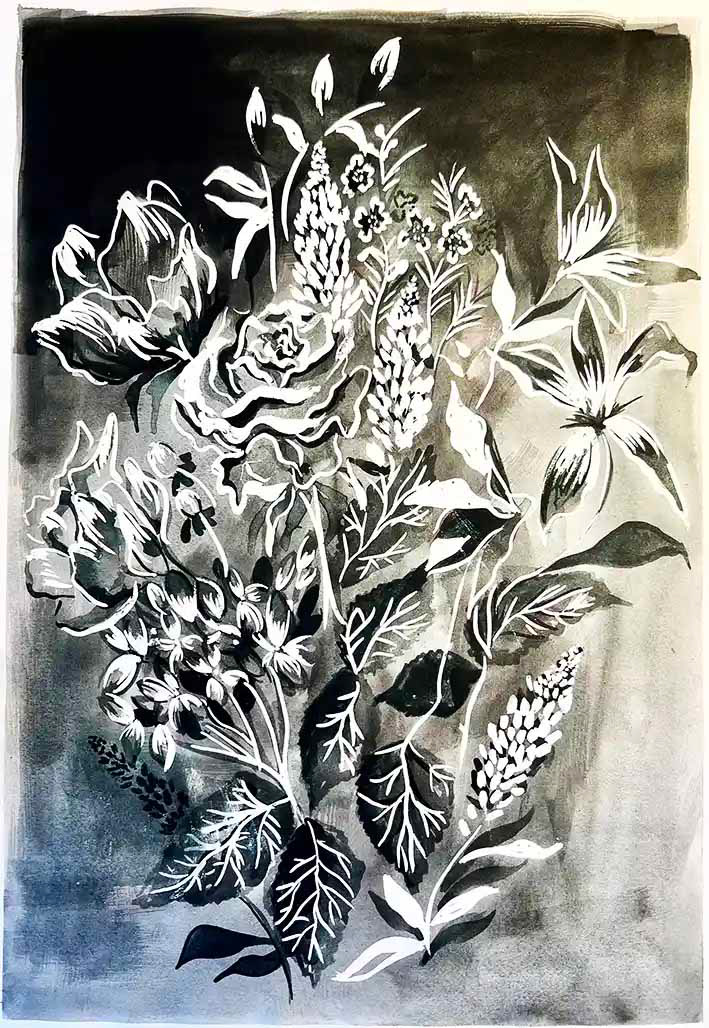 A collection of monochrome blooms inspired by floral photography captured at the 2023 Harrogate Flower Shows. Experimenting with a variety of monochrome media.